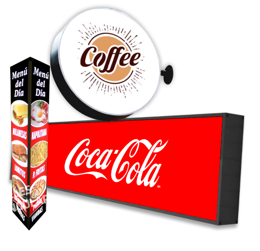 Fabricadas en metal y perfilería de aluminio, perfectamente adaptadas a las medidas de su fachada. Iluminadas desde el interior mediante tubos leds. En lona de alta gama o en acrilico, con vinilo de altas prestaciones y/o impresión digital laminada.